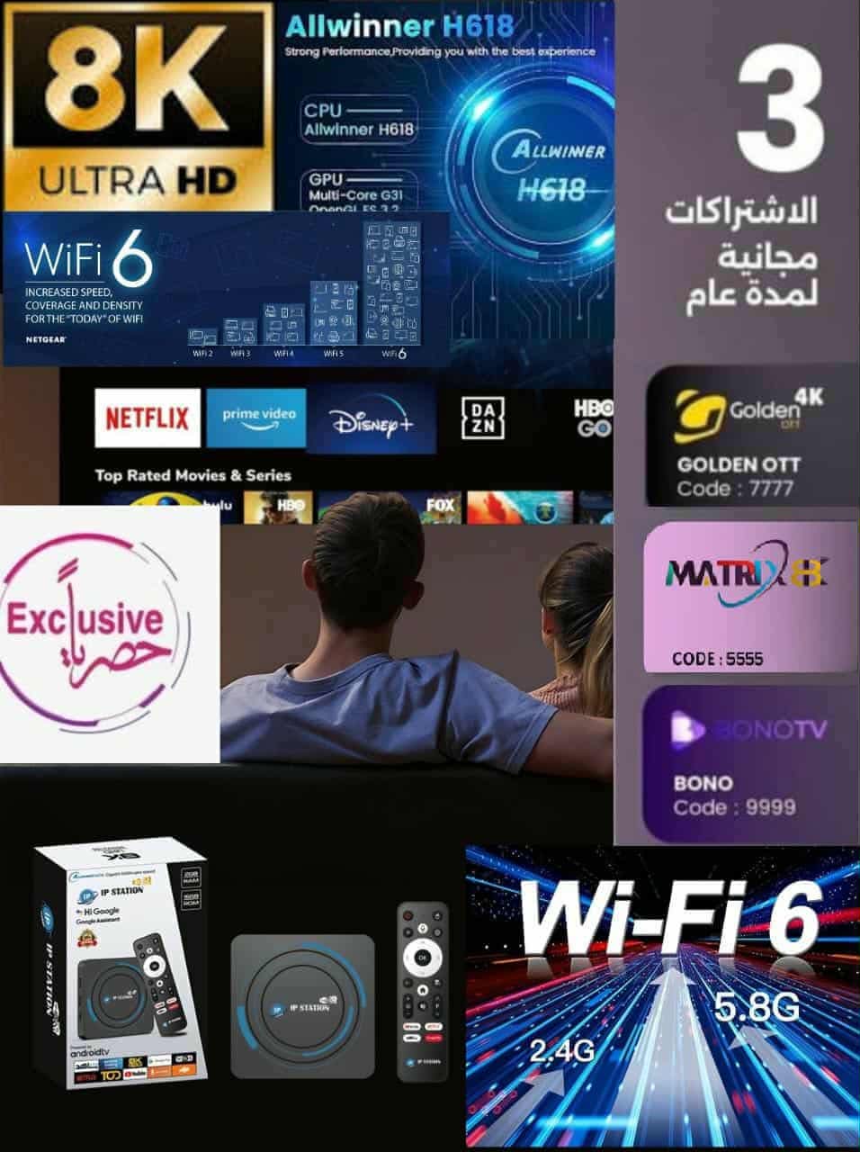 Avec la prise en charge du Ultra HD, IP STATION WIFI 6 garantit une qualité d’image nette et détaillée. Il est également livré avec trois abonnements intégrés, ce qui en fait une solution complète et prête à l’emploi pour les utilisateurs recherchant un TV Box fiable et puissant.